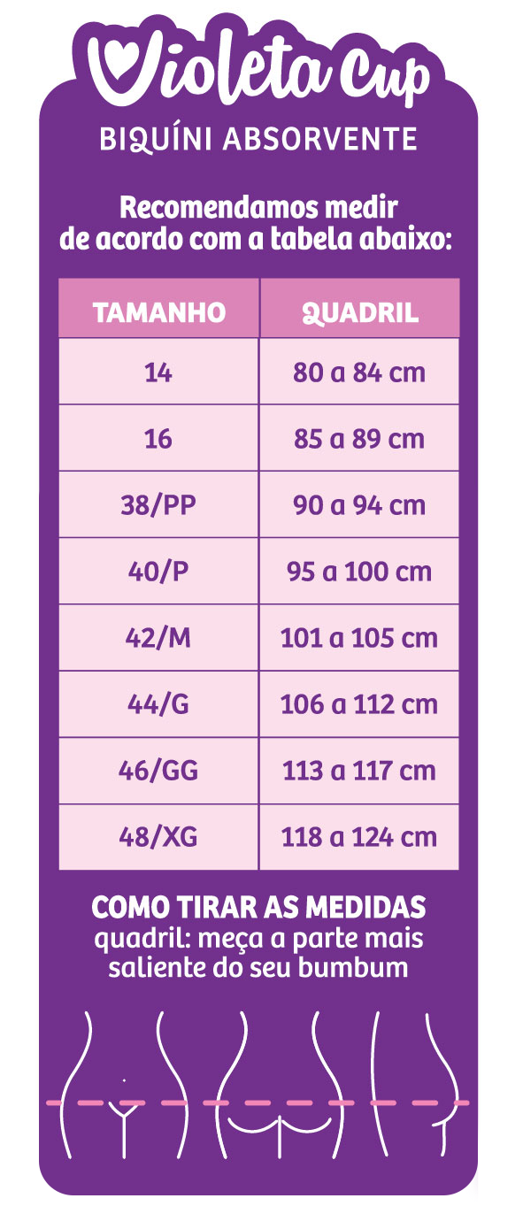 👙 Dica de ajuste: para maior conforto, escolha 1 tamanho maior no caso de quadril e bumbum mais volumosos ou se as medidas estiverem bem no limite.